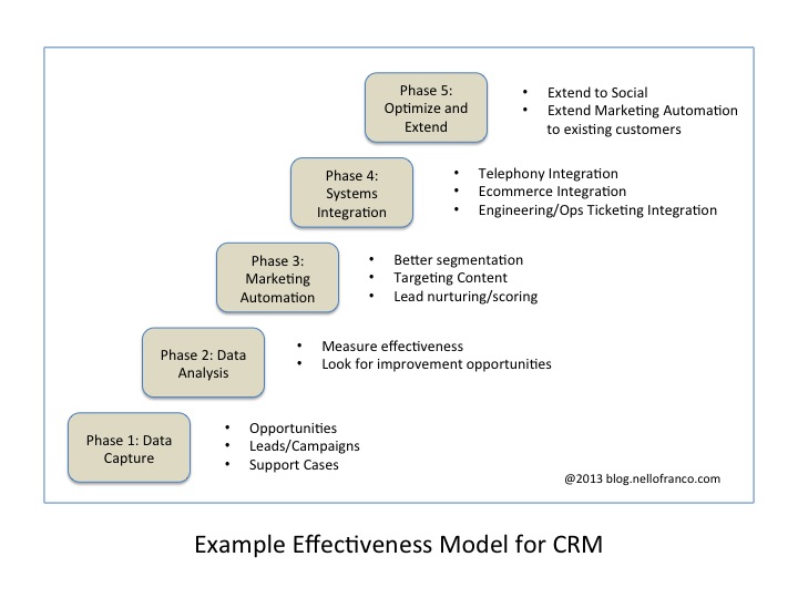 Identify 3-5 phases that are indicative of customers’ implementation of your technology. You may want to start with the bookends. For your first phase, identify the basics that someone absolutely needs to implement in order to get value from your application. For your last phase, identify what the absolute, best-in-breed, thought leaders who have, or will implement, your type of technology are doing. Then map out 1-3 interim phases that are indicative of how companies would progress through the phases. The CRM Effectiveness Model I put together above is an example of what that might look like.