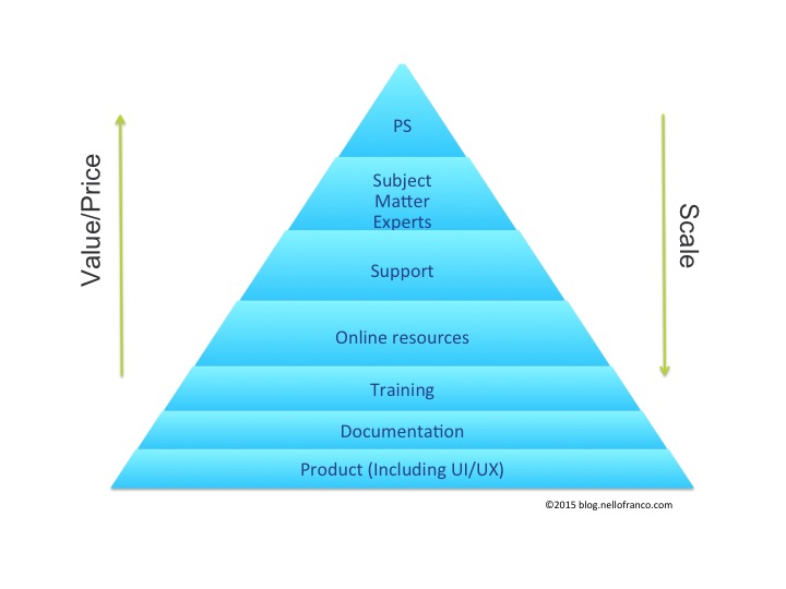 I wouldn’t argue that any of these is more important than another, and each type of product (consumer, SMB, enterprise) will have a different Customer Success pyramid, or will have different dependencies on different layers of the pyramid. In some companies and for some products, the specific levels of the pyramid may differ, and in consumer products, some levels may not even exist. The diagram I show here is designed for delivering Customer Success to B2B customers. A consumer-only product will likely not have a Professional Services component to it; however as even some “consumer” products are moving into the B2B space, they’ll need to add less scalable, and more specialized offerings in order to make their higher value customers successful.